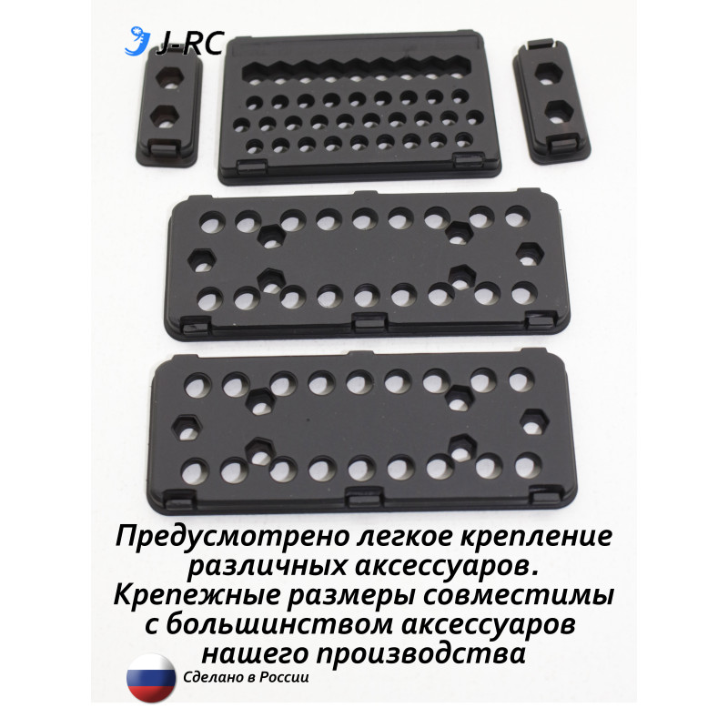 Система выполнена с отверстиями и углублениями для гаек М3 для крепления к окнам канистр, домкратов, сэнд-траков и других аксессуаров. Совместимо с большинством аксессуаров производства J-RC.