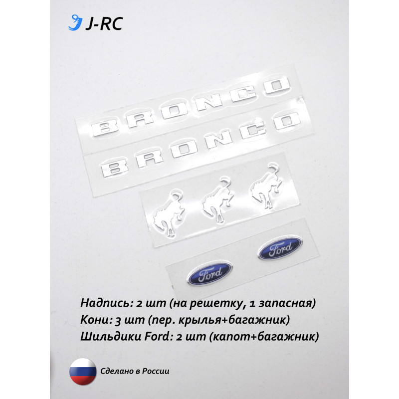 В комплекте: надписи BRONCO (на черной подложке и без подложки) - 2 шт., кони - 3 шт, шильдики FORD - 2 штуки
